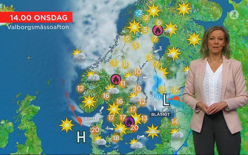 Källa: Linda Eriksson, meteorolog på tv4. Senast uppdaterad: 29 april 2025 (Bild från tv4play)